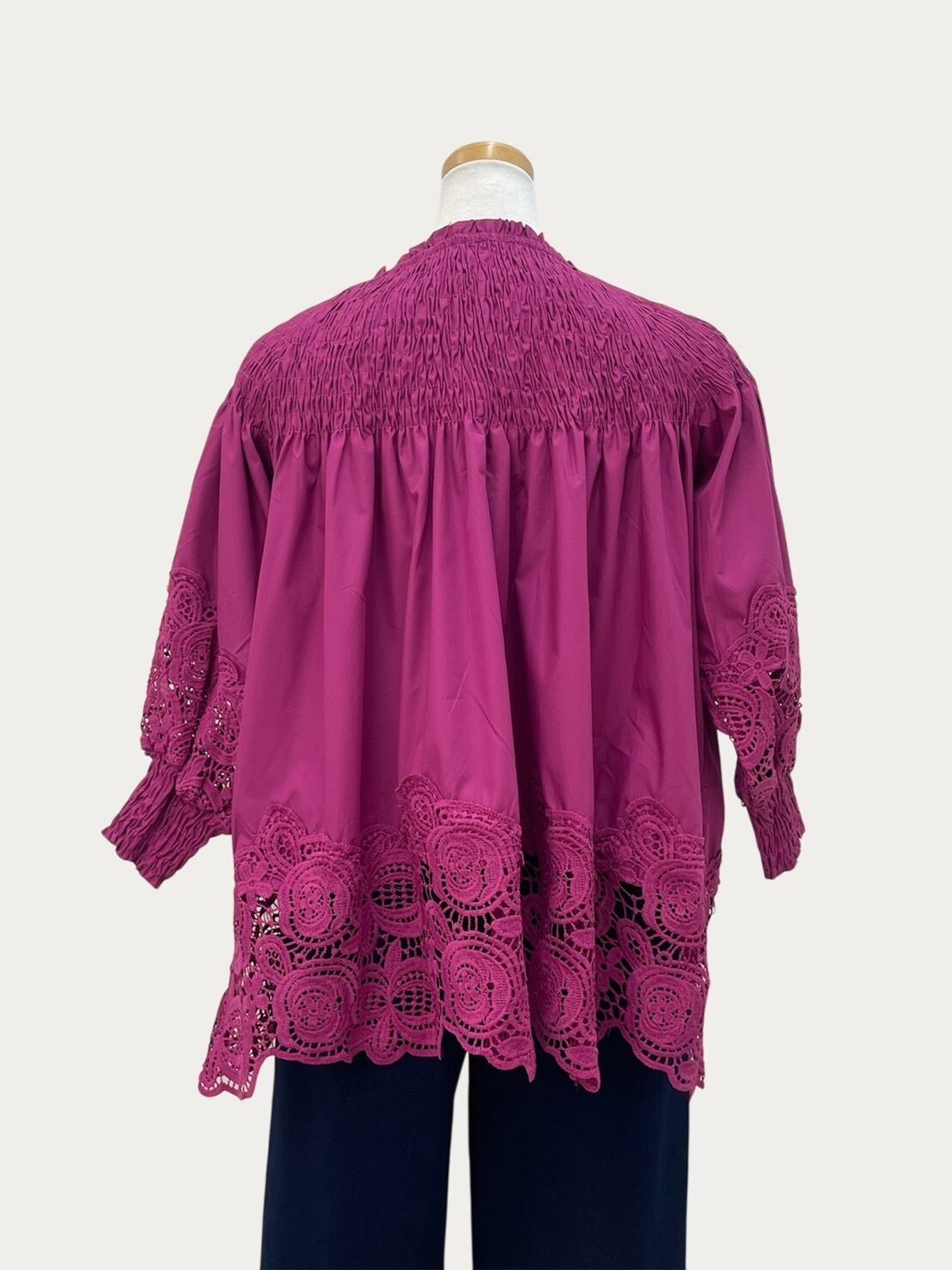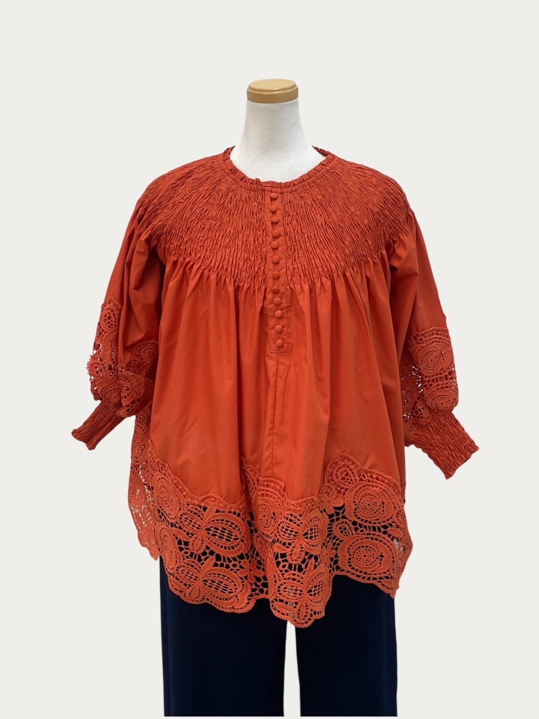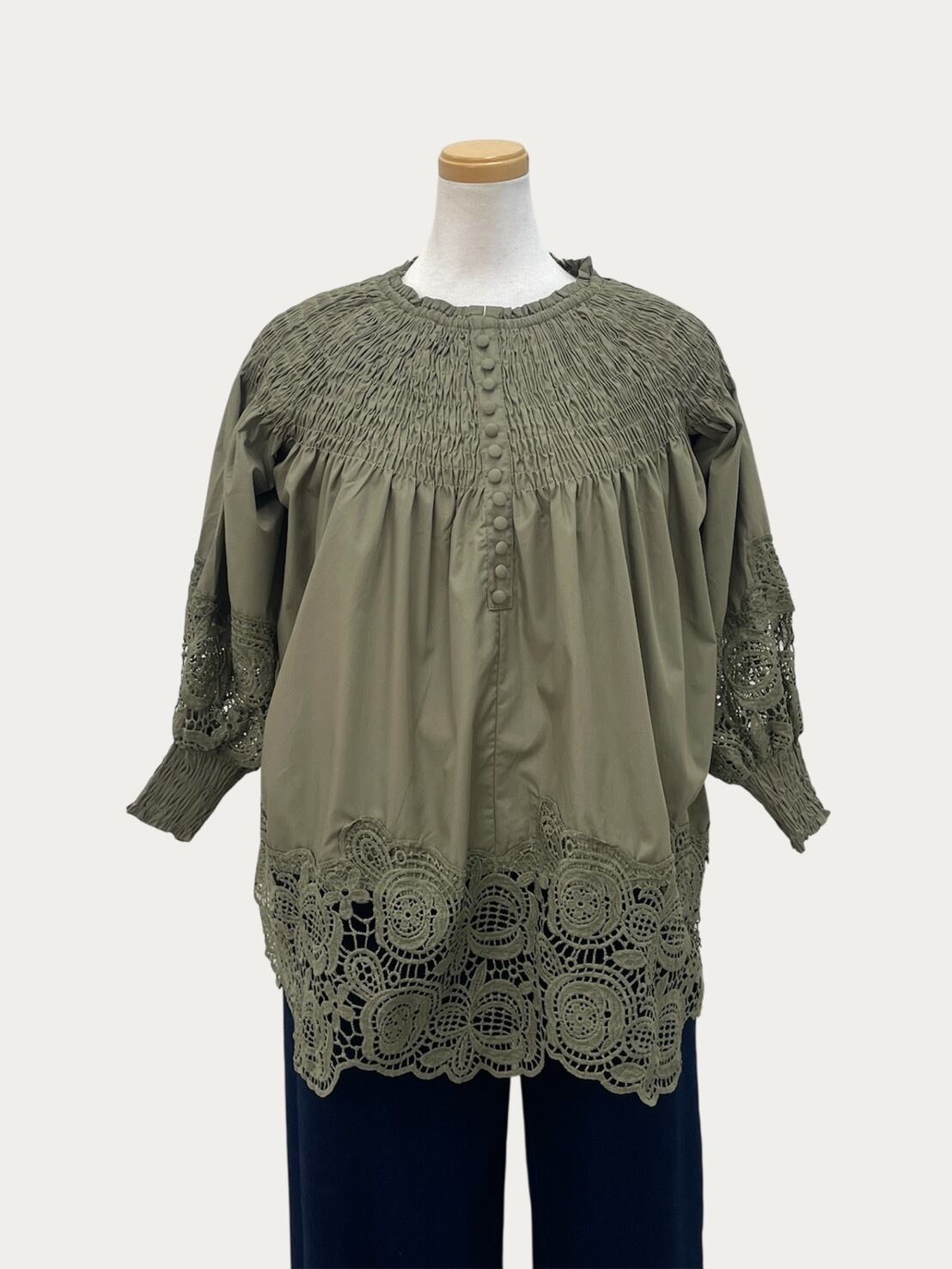 バラレースがふんわり広がるデコルテシャーリングブラウス