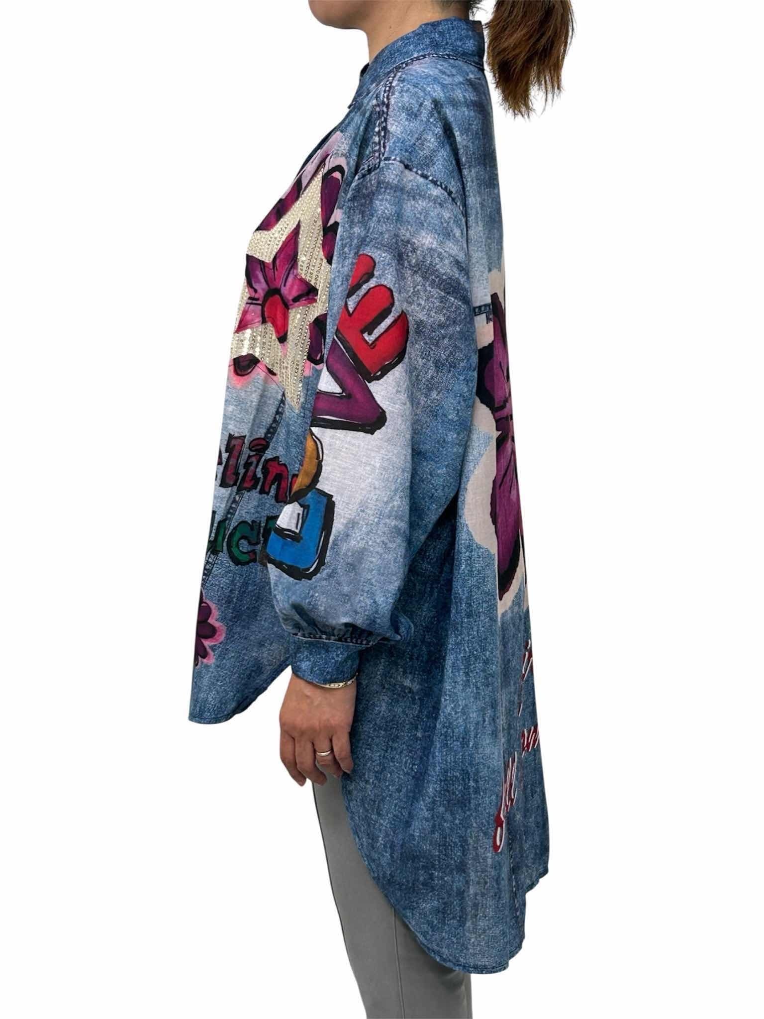 星スパンコールデニム風プリントブラウス