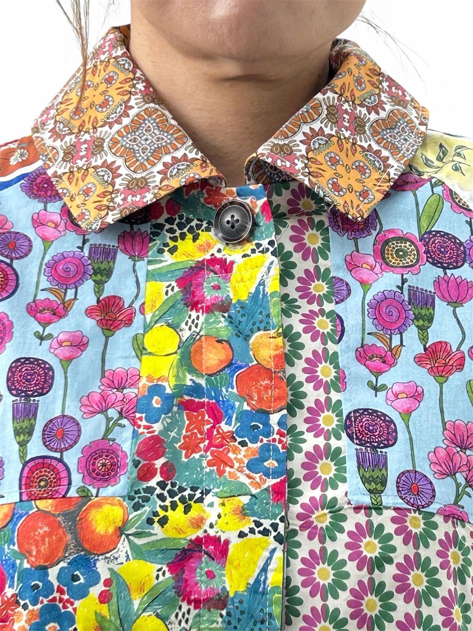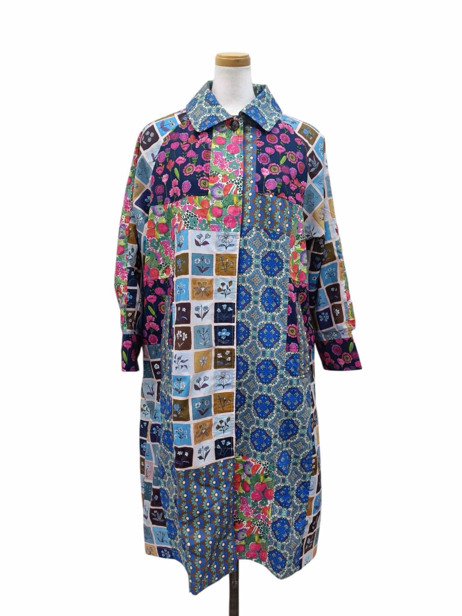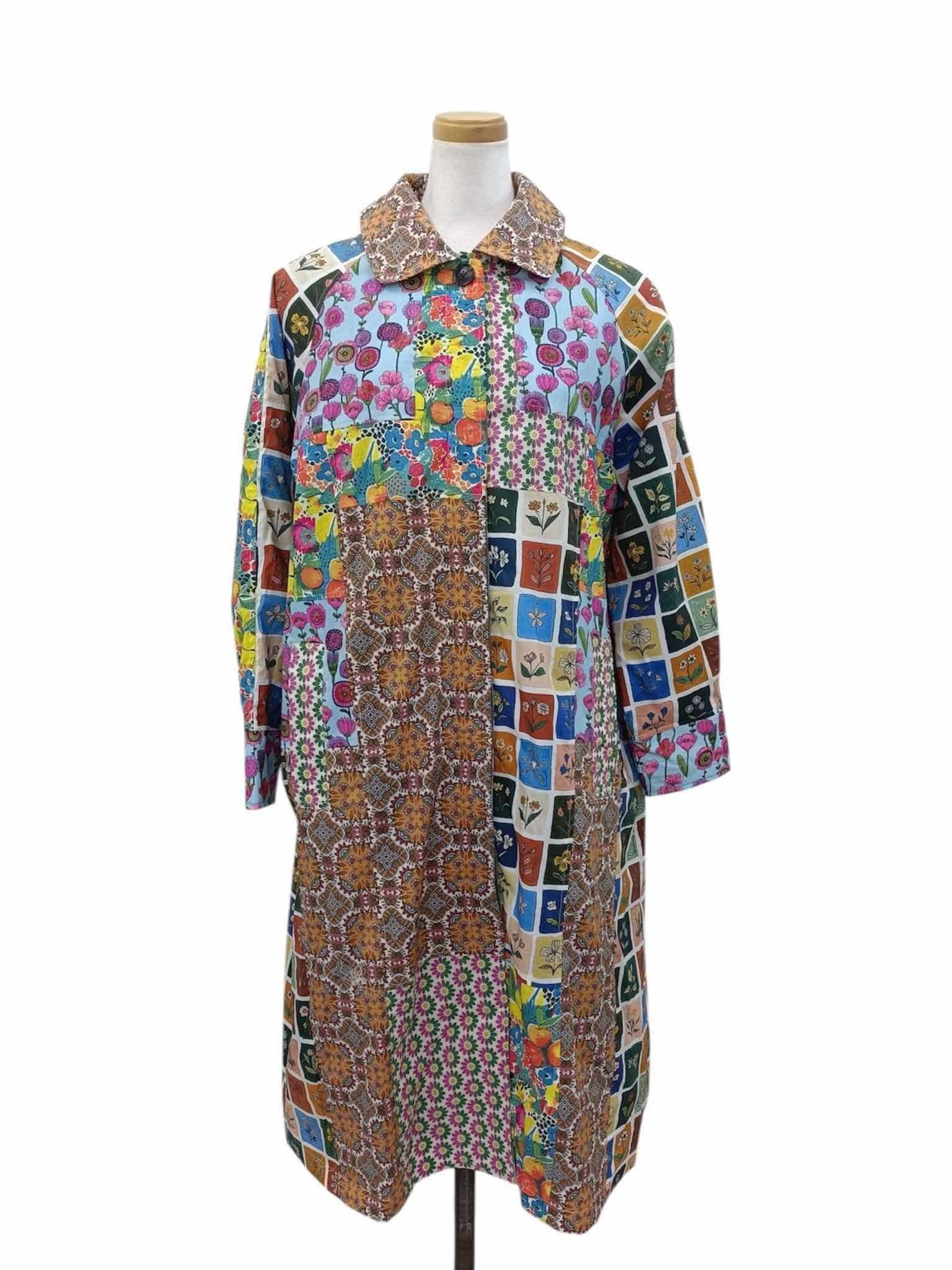 様々な色や柄を巧みに組み合わせた、遊び心たっぷりのパッチワークデザインが目を惹くステンカラーコート。