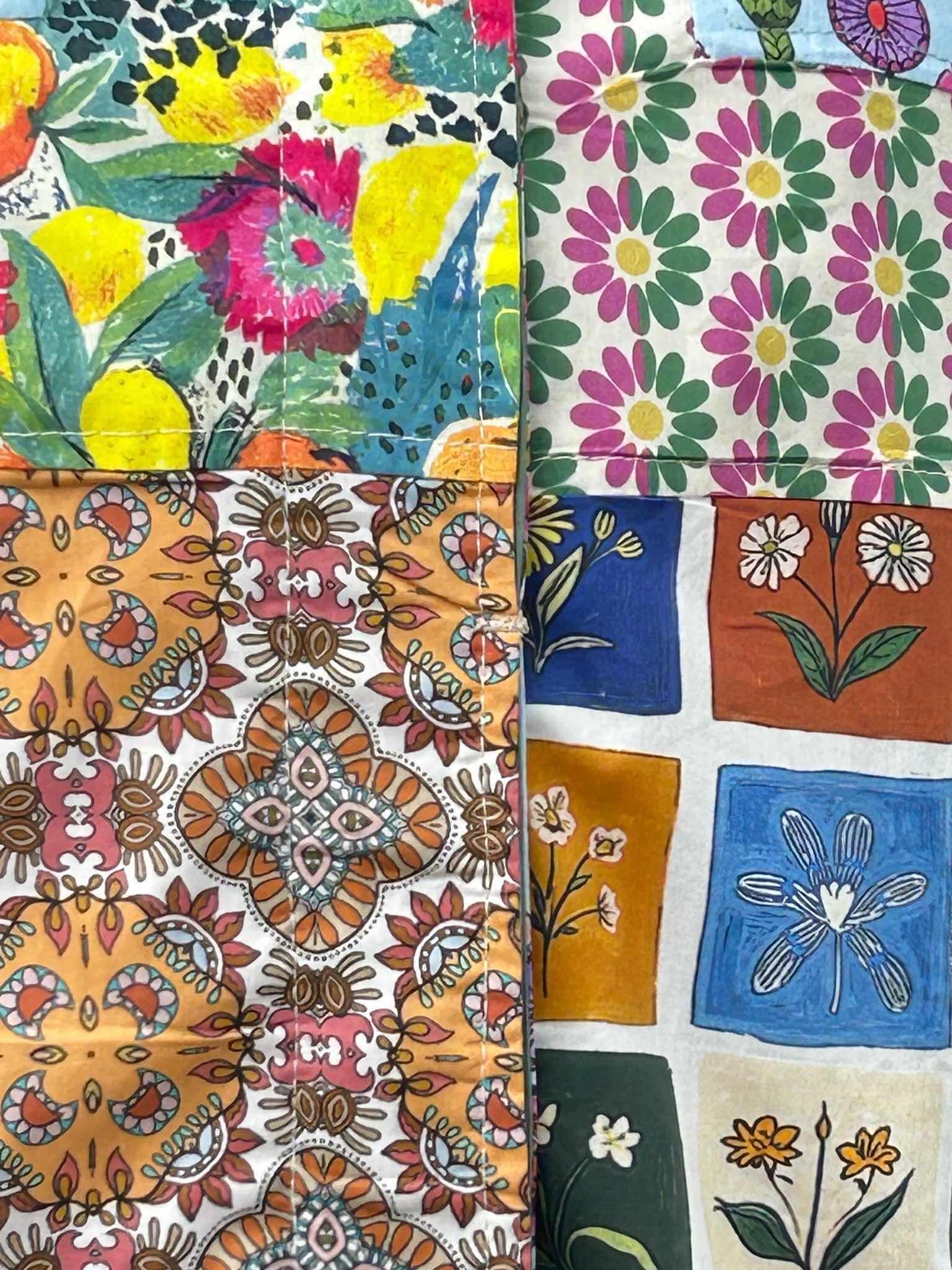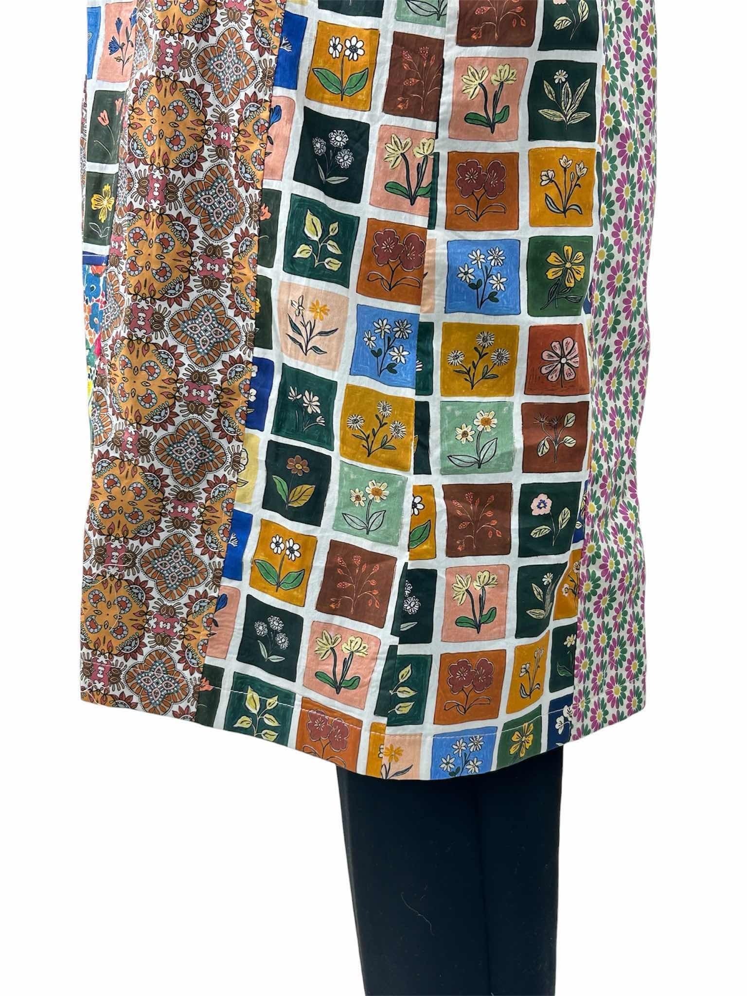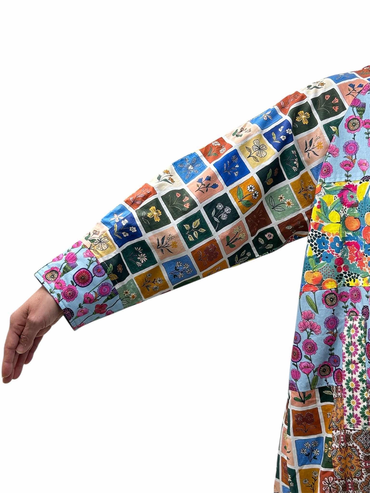 様々な色や柄を巧みに組み合わせた、遊び心たっぷりのパッチワークデザインが目を惹くステンカラーコート。