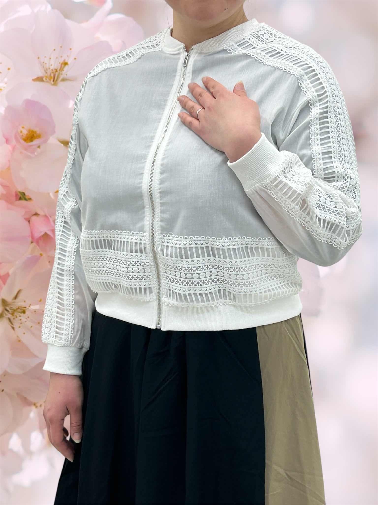 今シーズンのトレンド筆頭である「レース」を贅沢に使用した、軽やかなブルゾンが登場しました。
